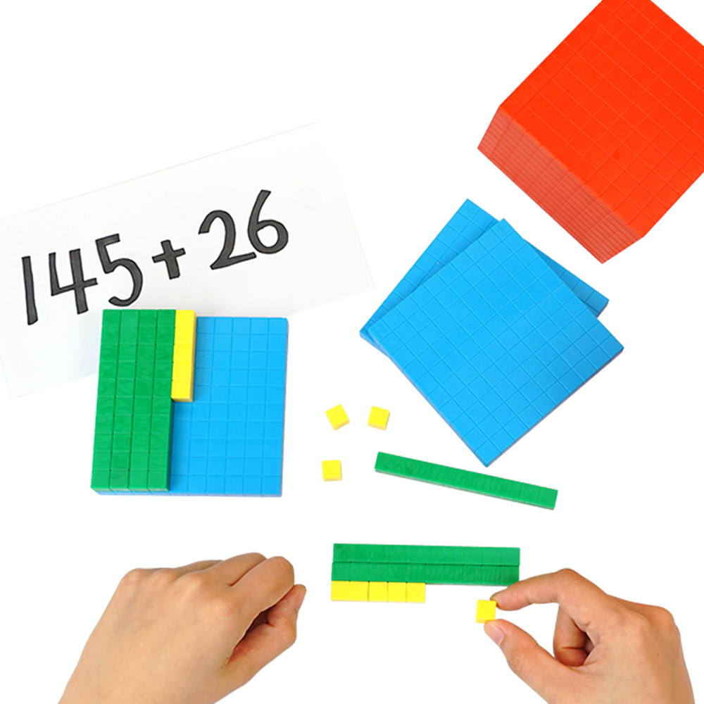This set contains 100 yellow units (1x1x1cm), 10 green rods (1x1x10cm), 10 flats(1x10x10cm), 1 red cubes (10x10x10cm).